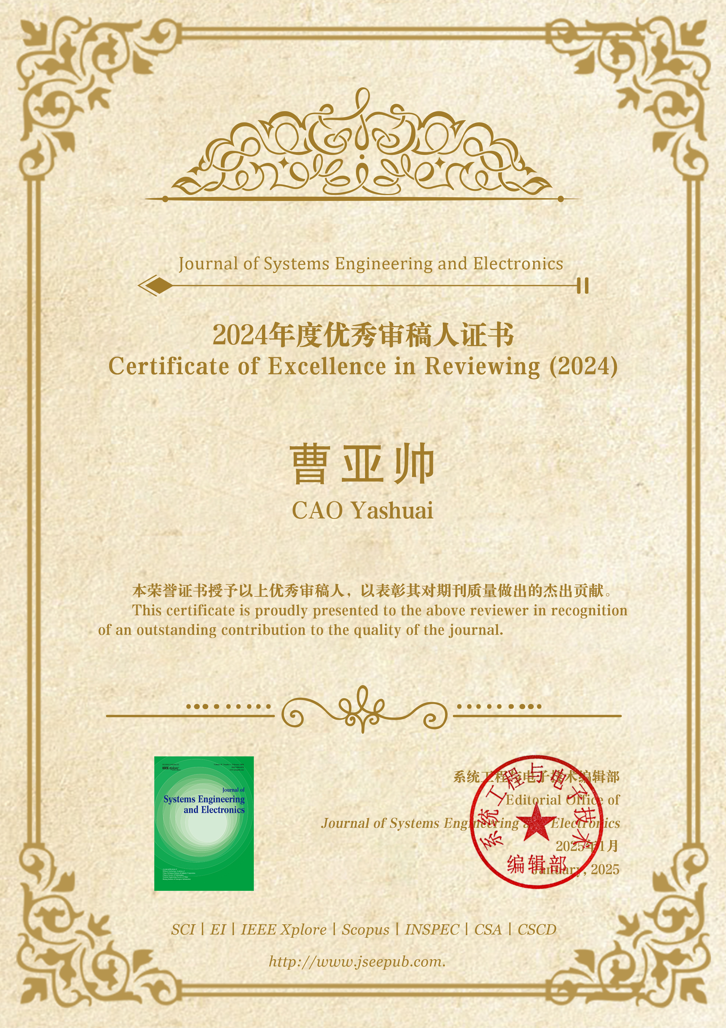 3. 《系统工程与电子技术》与《JSEE》两刊2024年度杰出审稿人, 2024.12.23