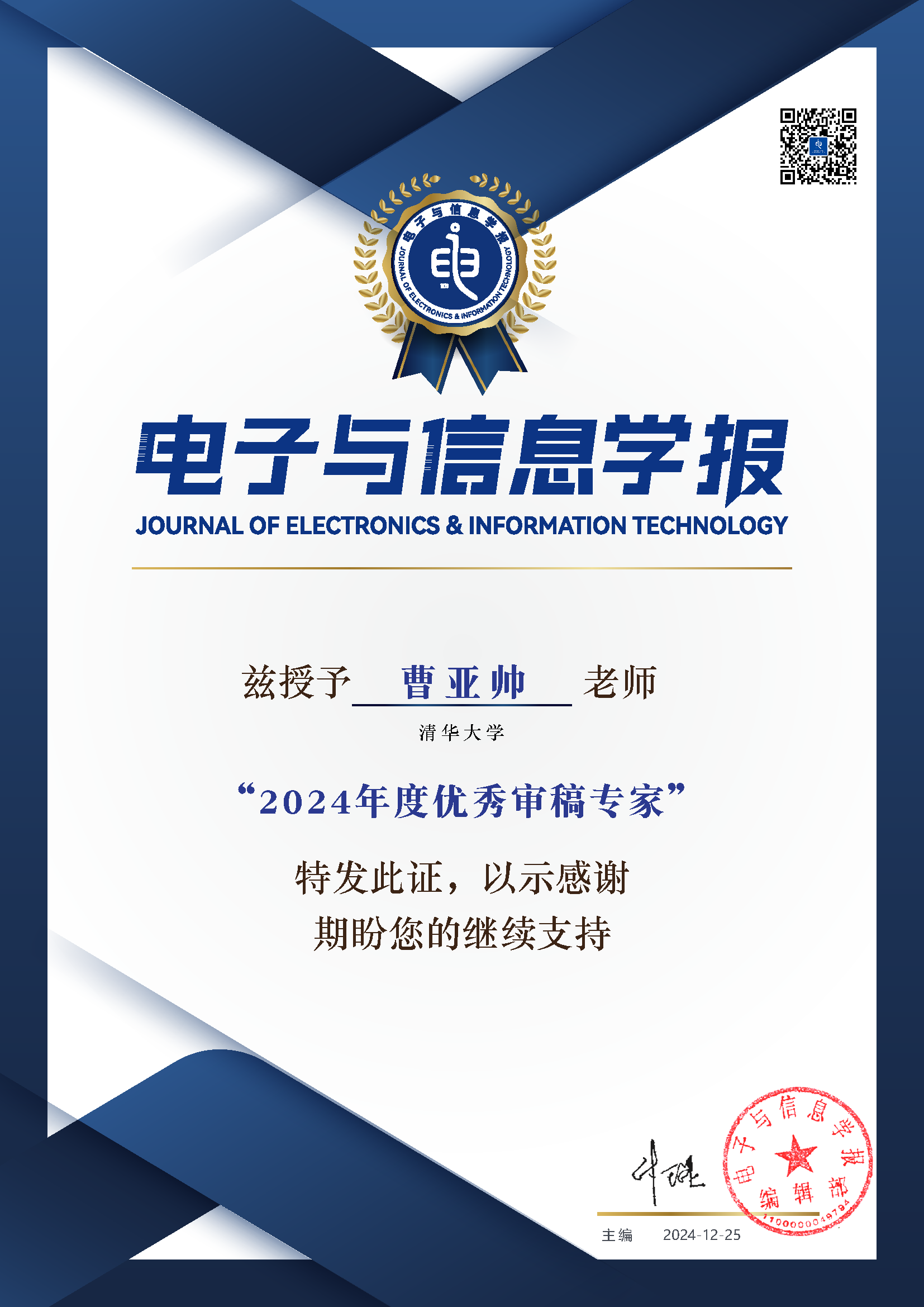 1. 《电子与信息学报》2025年度优秀审稿专家, 2026.1.7